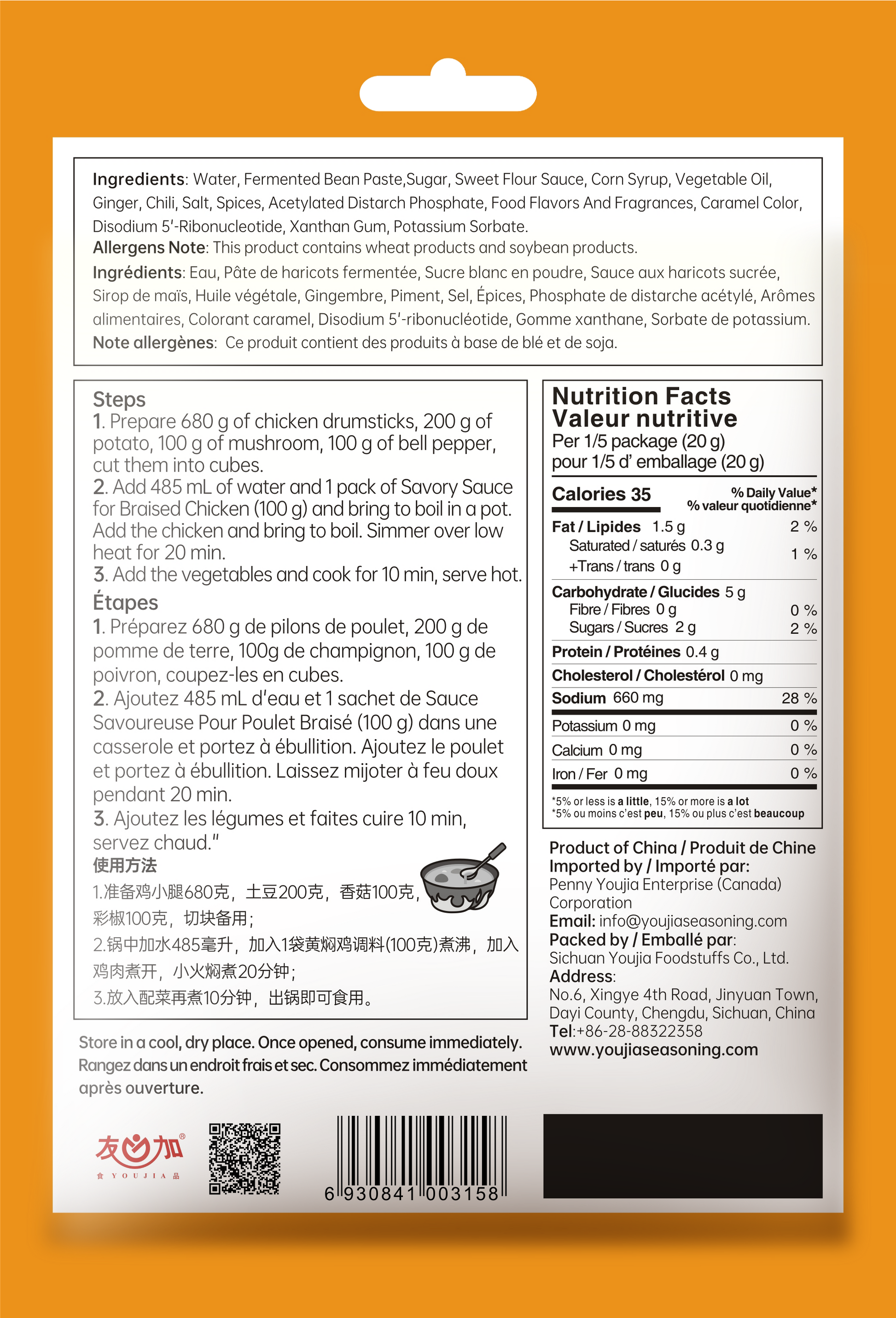 Introducing our Savory Sauce for Chicken! Elevate your chicken dishes with our flavorful sauce. Experience the perfect balance of savory and spicy flavors in every bite. Our 100g pack provides the ideal portion for your chicken recipes. Effortlessly create mouthwatering Braised Chicken with our user-friendly sauce. Its versatility extends beyond chicken, enhancing various stir-fry and grilled dishes. Discover a new level of taste with our Savory Spicy Sauce for Chicken: